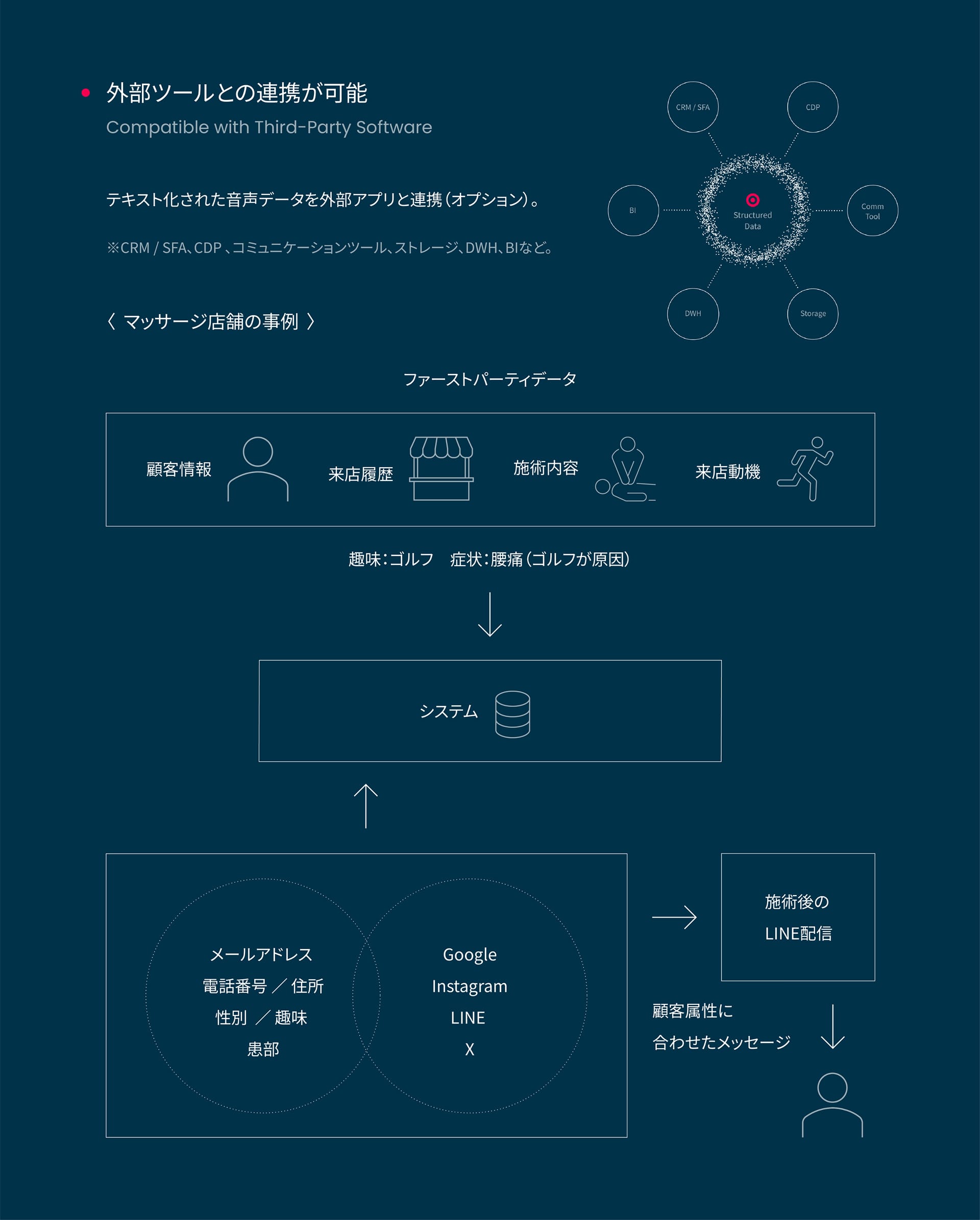 04 / 04ビジネスへ活用可能なデータをCRMシステムと連携Seamless integration of business-ready data with CRM systems.